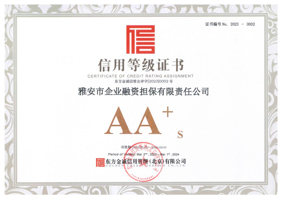 33日,雅安市企業(yè)融資擔保有限責任公司(以下簡稱市擔保公司傳來喜訊,經(jīng)東方金誠信用管理(北京)有限公司通過對市擔保公司的信用狀況進行綜合分析和評估,確定該公司信用等級為AA+。