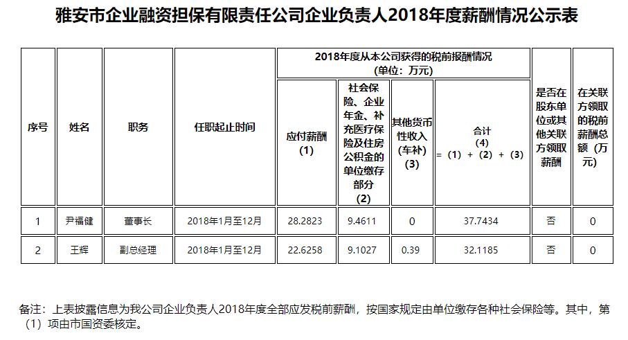 雅安市企業(yè)融資擔保有限責任公司企業(yè)負責人2018年度薪酬情況公示表